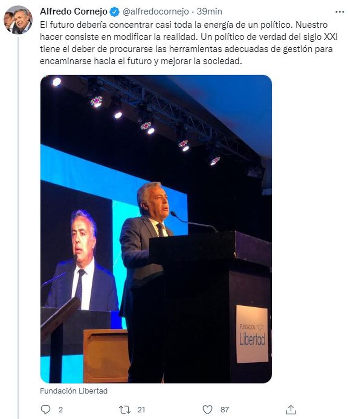 "Estamos en la cena anual de la Fundación Libertad junto a otros referentes políticos nacionales. Acompañamos su trabajo y el impulso a las ideas de la libertad, tan necesarias para el futuro de la Argentina", expresó Cornejo, quien incluso tuvo oportunidad de dar un discurso.