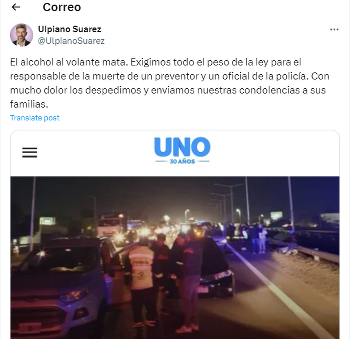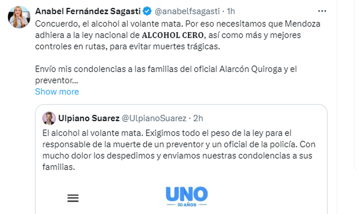 El intendente de Capital, Ulpiano Suarez, el de Godoy Cruz, Diego Costarelli, la nacional Anabel Fernández Sagasti (PJ) y el dirigente Jorge Tanús (expresidente del Banco BICE) se expresaron con dolor en las redes sociales por la muerte del preventor de Tránsito y del policia vial.