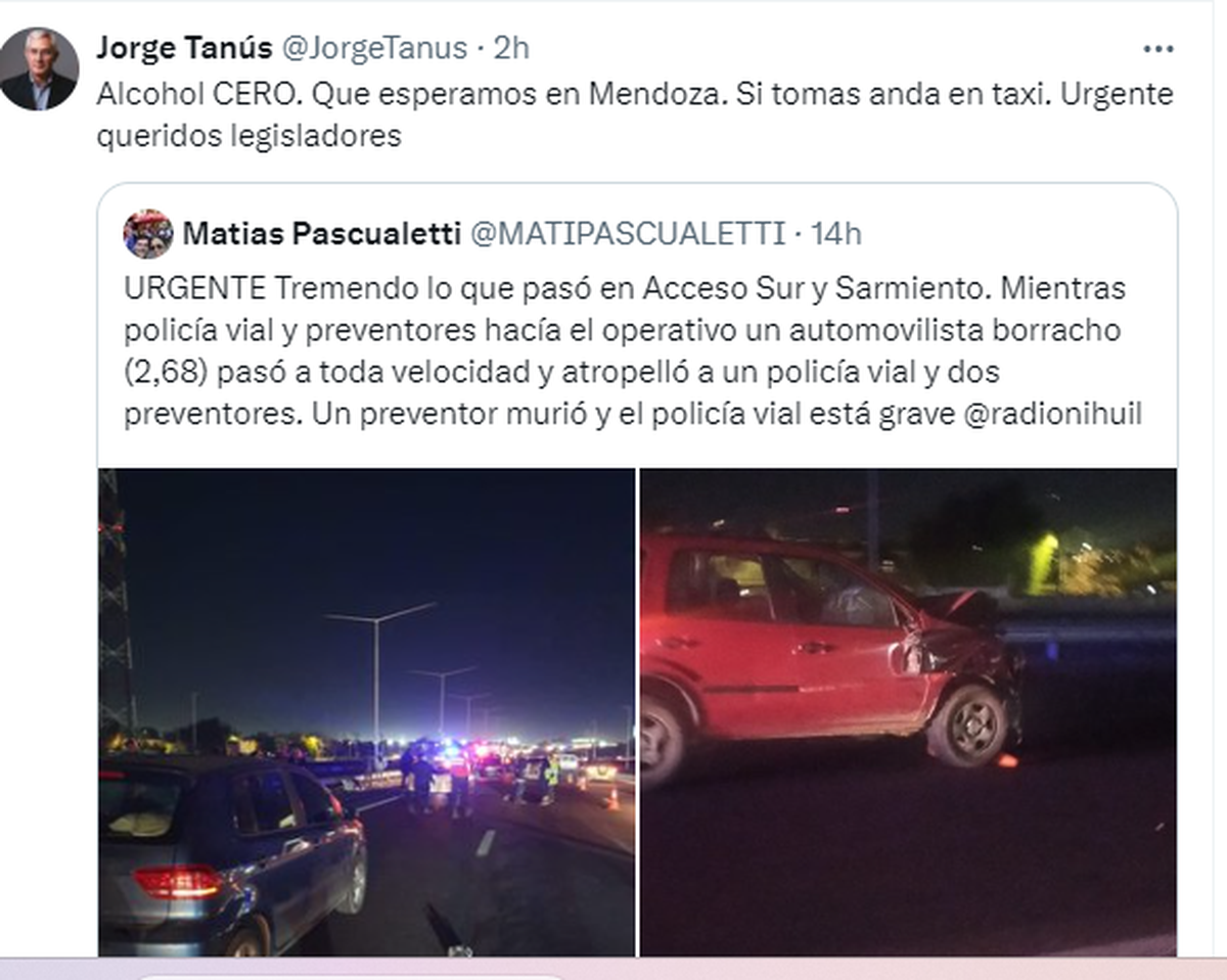 En el mismo sentido se expresó en X el peronista Jorge Tanús. El político mendocino manifestó que adherir a la ley de Alcohol Cero es urgente e instó a los legisladores a dar este paso.