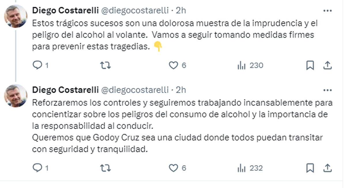 Costarelli manifestó que "con dolor y bronca" lamentan en la Municipalidad de Godoy Cruz el fallecimiento tanto del preventor que era parte del municipio que él lidera, como de Alarcón, integrante de la policía vial.