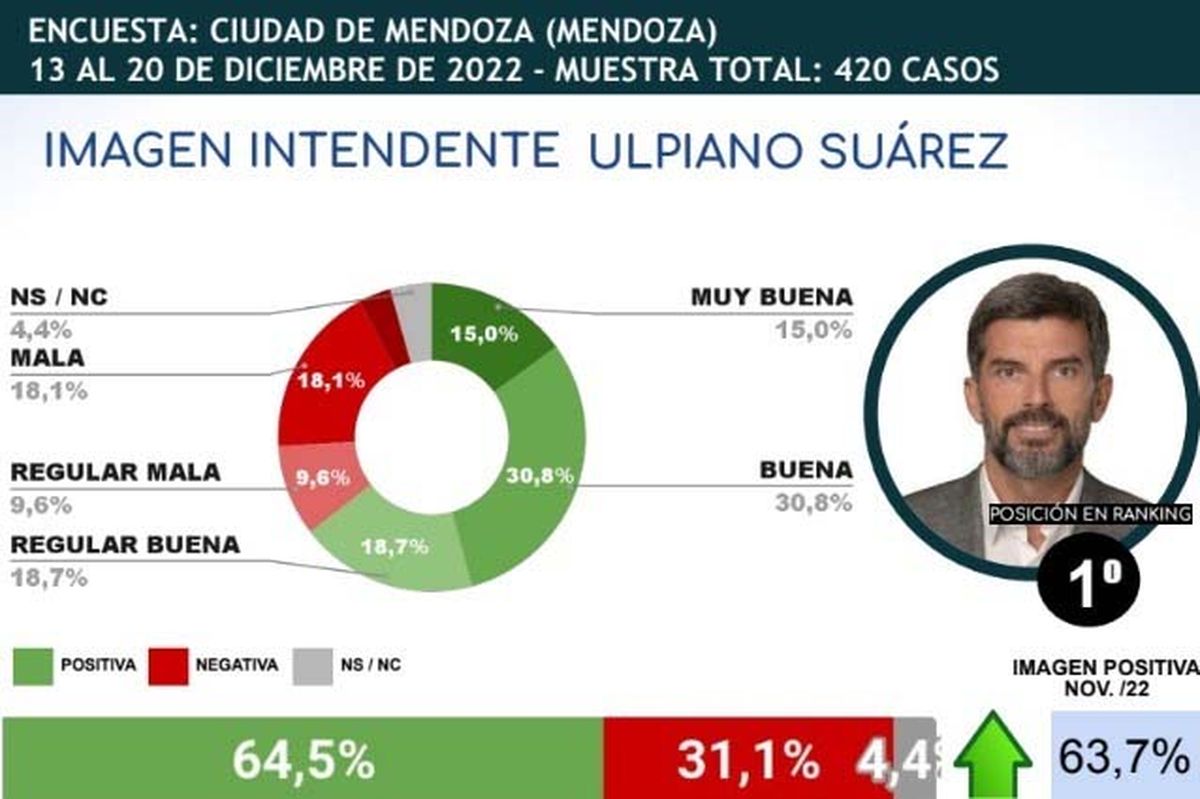 El intendente de la Ciudad de Mendoza, Ulpiano Suarez, dio un gran salto y figura en el puesto número 1 del ranking de imagen positiva de los principales jefes comunales del país (estaba sexto en la última medición privada), donde no aparece ningún otro mendocino con cargo ejecutivo municipal, ni radical ni peronista. El gobernador Rodolfo Suarez subió un escalón en la misma lista en relación a la última medición y se ubicó en el sexto lugar.