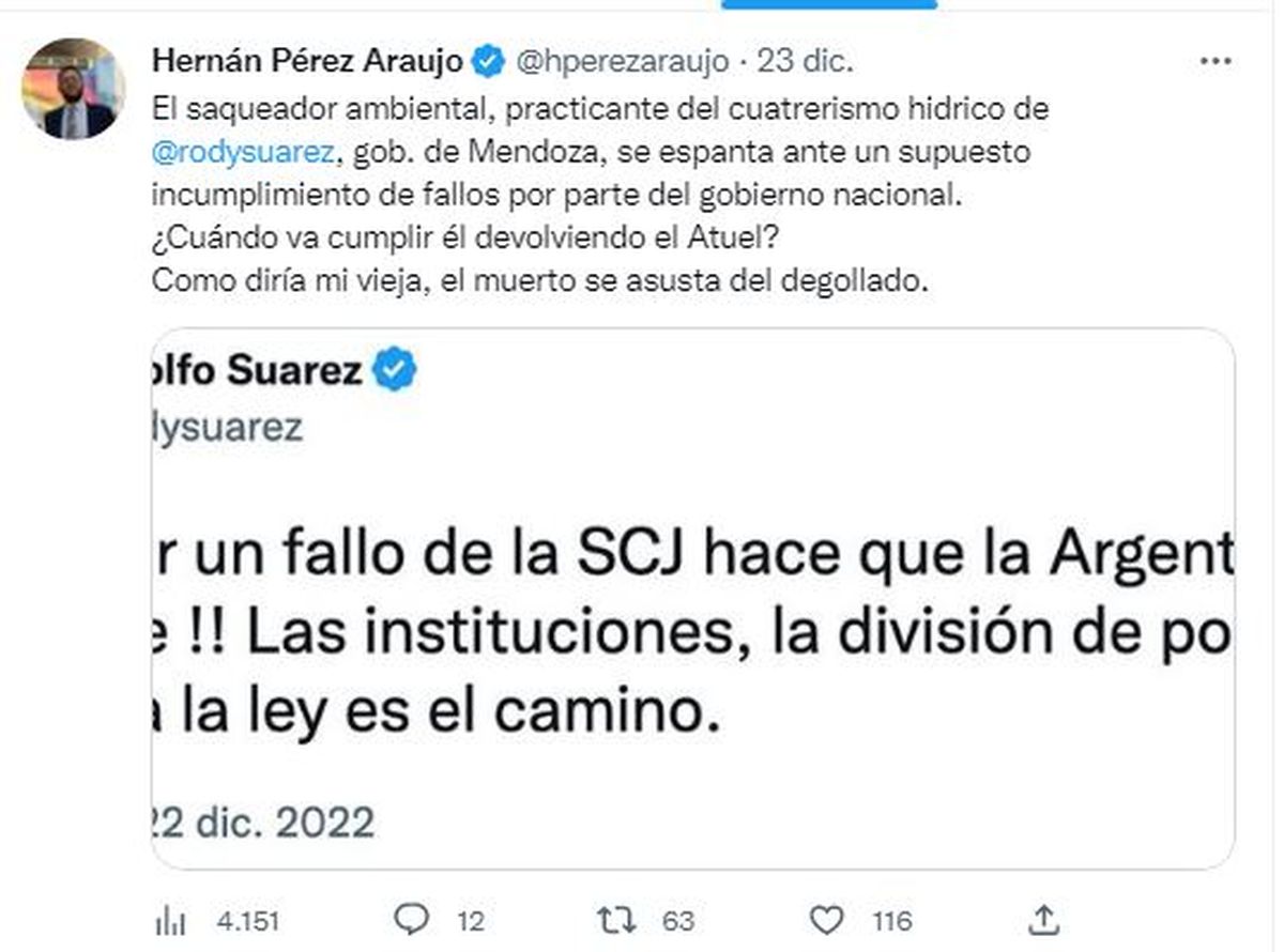 Ese tuit de Pérez Araujo fue en respuesta a otro de Suarez en el que se refirió a la posición de la Nación respecto del mencionado fallo del máximo tribunal de justicia de la Nación: "¡No acatar un fallo de la SCJ hace que la Argentina sea imposible !! Las instituciones, la división de poderes, el respeto a la ley es el camino!"