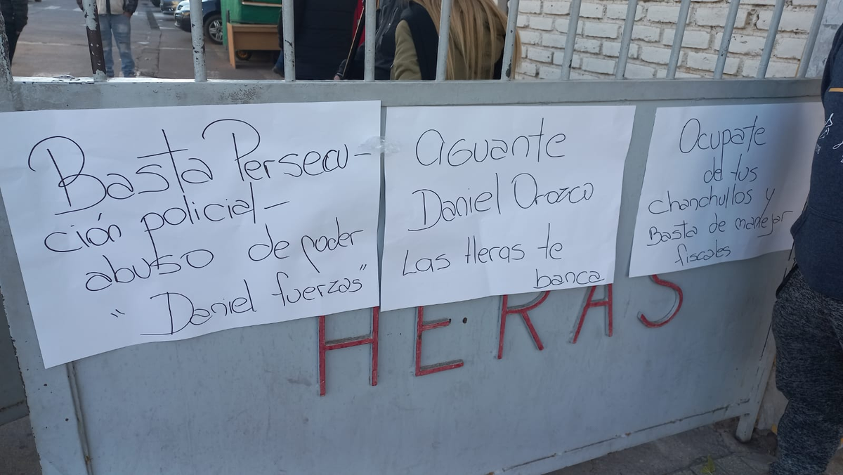Desde el interior del edificio, municipales de Las Heras apoyaron a Orozco con pancartas colgadas de los portones con leyendas como "Basta de persecución policial y abuso de poder".