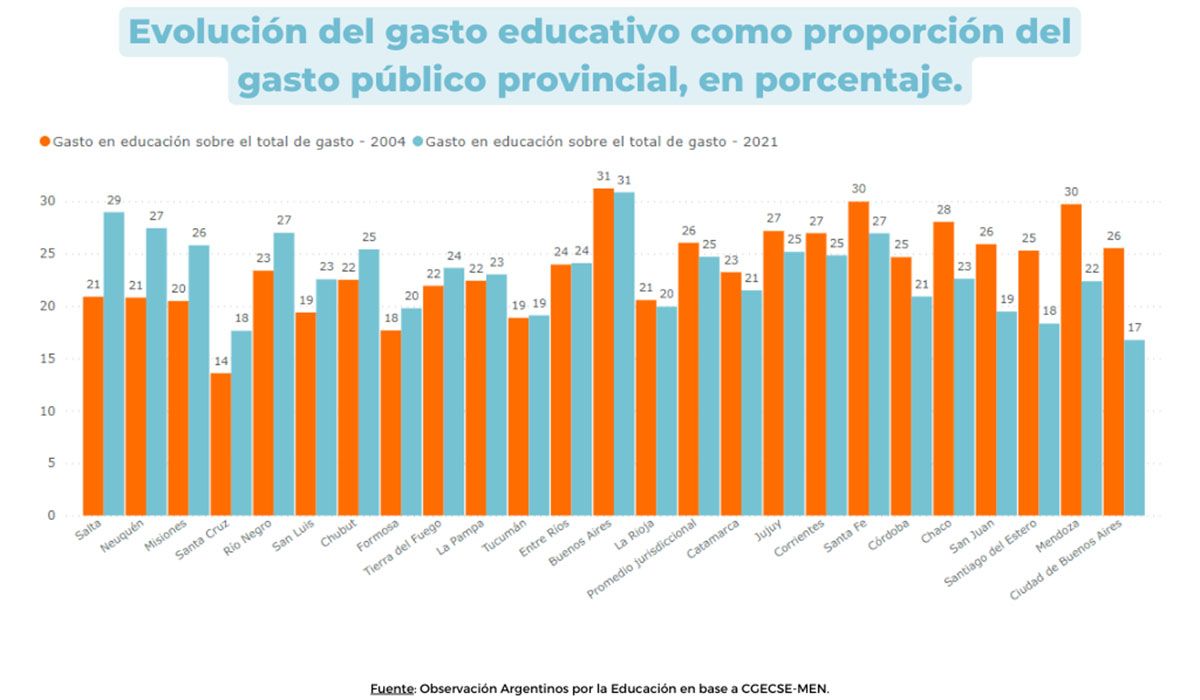 Según el informe de Argentinos por la Educación, al comparar el año 2021 con 2004, surge que Salta y Neuquén fueron las que más aumentaron la proporción de su presupuesto destinado a educación, 8,1 y 6,6 puntos porcentuales respectivamente.