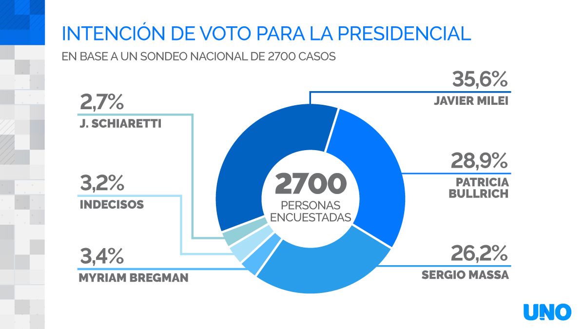 En la pregunta clásica sobre la intención de voto se preguntó por el candidato a que se votará el 22 de octubre. Acá no hay dudas y Javier Milei es el candidato a ser el más votado.