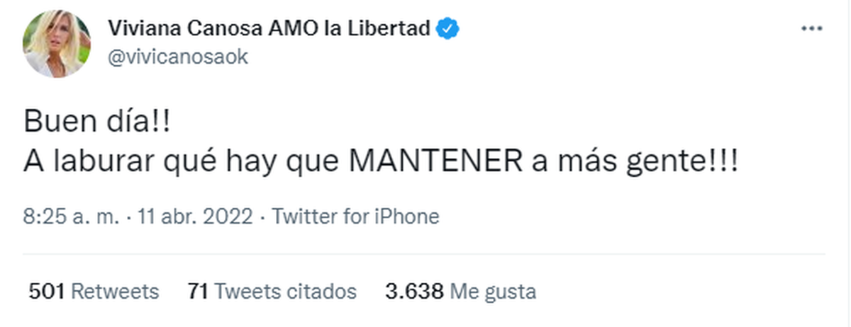 "Buen día!! A laburar qué hay que MANTENER a más gente!!!", escribió irónicamente Canosa en su cuenta de Twitter.