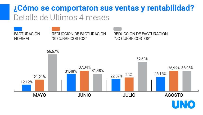 A juzgar por lo que revelaron en la encuesta, esas 30 empresas que planean cerrar están en el grupo de firmas que en agosto aún no logran cubrir los costos. El sondeo mostró que el 36,93% de las encuestadas no consiguió una facturación que le permita hacer frente a los gastos que tiene.