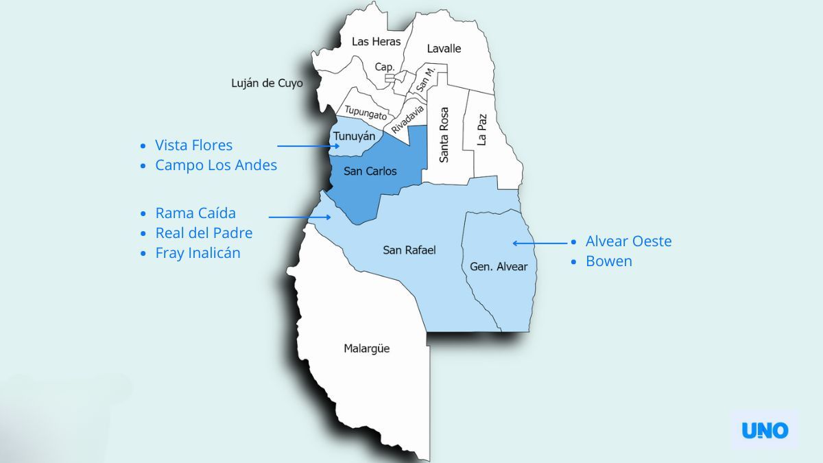 Puntualmente, le corresponden a la subdistribuidora Vista Flores, Campo Los Andes, La Consulta, Eugenio Bustos, San Carlos, Pareditas, Chilecito, Villa Chacón, Alvear Oeste, Bowen, Rama Caída, Real del Padre y Fray Inalicán.