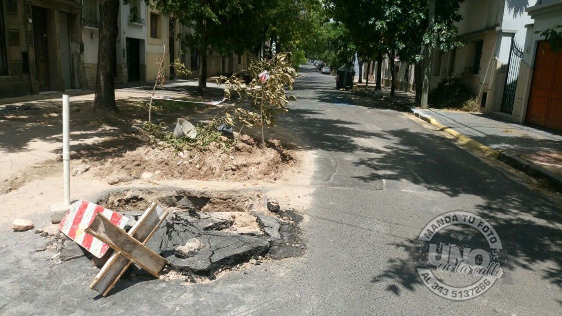 En calle Feliciano, entre San Martín y Monte Caseros, hay dos pozos de importantes dimensiones producto de arreglos no concluidos por parte de la Municipalidad de Paraná. Tras las lluvias del fin de semana, se llenaron de agua.