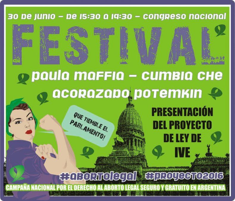 El hashtag #AbortoLegal es tendencia en Twitter una hora antes de lo que estaba previsto generando aún más expectativas en la previa de la presentación de un nuevo Proyecto de Ley de Interrupción Voluntaria de Embarazo (IVE), Integrantes de la Campaña Nacional por el Derecho al Aborto Legal, Seguro y Gratuito, acompañadas por algunas de las diputadas que firmaron el proyecto, entre ellas la entrerriana Carolina Gaillard (FpV) y Victoria Donda (Libres del Sur) realizarán una conferencia de prensa desde las 16 en la sala 2 del Anexo de la Cámara de Diputados de la Nación, en Riobamba 25, Ciudad Autónoma de Buenos Aires.En las adyacencias desde las 15:30 se realizará un festival, apoyado en una radio abierta, en donde actuarán Paula Maffia, Acorazado Potemkin y Cumbia Che.