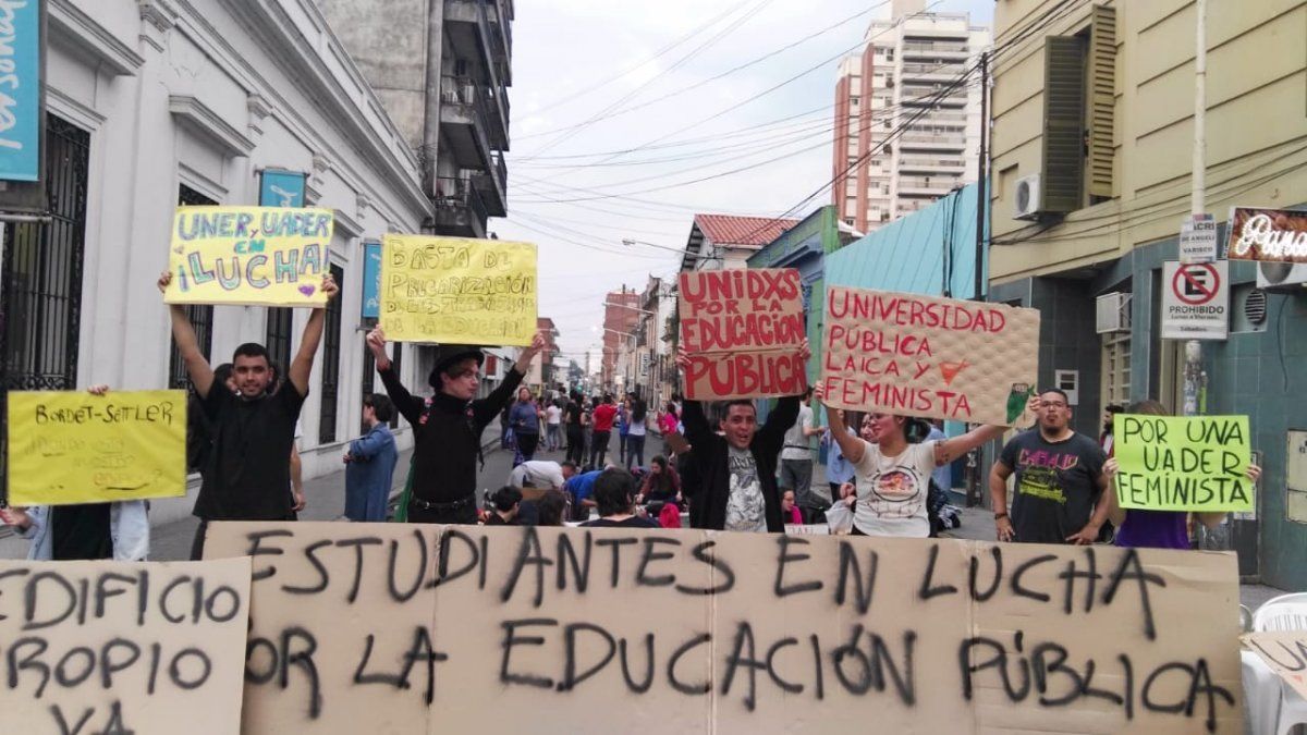 Estudiantes de la Universidad Autónoma de Entre Ríos (Uader) cortaron la calle en señal de protesta y para solidarizarse con sus compañeros de la Universidad Nacional de Entre Ríos (UNER) que continúan con las tomas pacíficas de los edificios de Ciencias de la Educación y Trabajo Social.