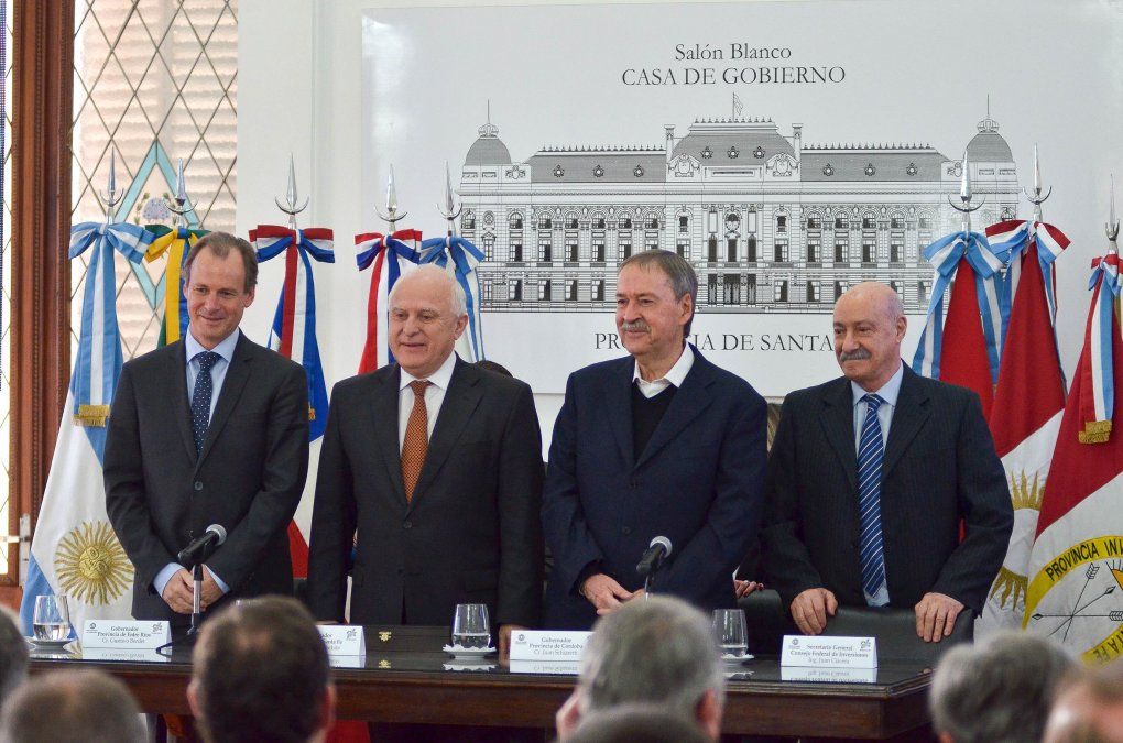 El gobernador Gustavo Bordet participó este martes junto a sus pares de Santa Fe, Miguel Lifschitz, y de Córdoba, Juan Schiaretti, y del titular del Consejo Federal de Inversiones, Juan José Ciásera, de la apertura de la jornada Corredor Bioceánico Central y la Hidrovía Paraguay-Paraná, desafíos del transporte y la producción de la Región Centro argentina, que se realizó en la Casa de Gobierno de la capital santafesina.