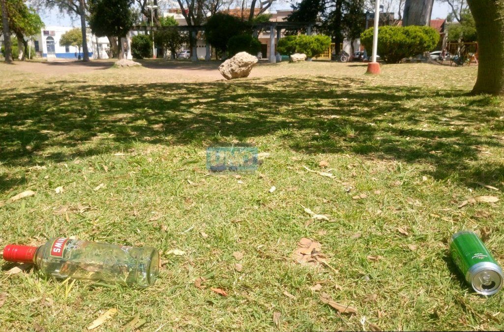 Hoy a la mañana había paquetes de cigarrillos, botellas y latas tiradas en el pasto. Nada les cuesta llegar hasta los basureros para descartar las sobras de lo que consumen pero también es cierto que algunos tachos están colapsados desde hace un par de días.