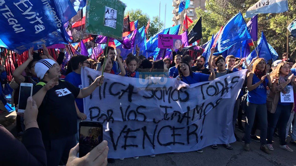 Afuera del centro hubo un cordón de seguridad que rodeó al edificio y organizó la entrada ordenada. También se destacó la presencia de los móviles de prensa de medios nacionales y provinciales. El lugar estaba embanderado con consignas y banderas militantes de #NiUnaMenos y Movimiento Evita a los que la joven pertenecía.