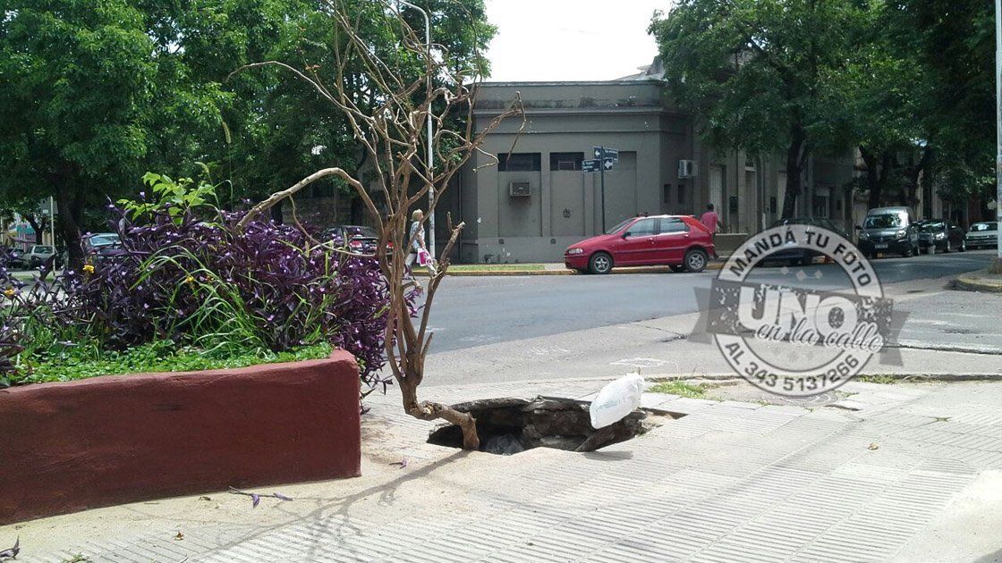 Hay un gran pozo en la vereda este de la esquina de calles Santiago del Estero y Tejeiro Martínez, en Paraná. El agua aflora a simple vista.