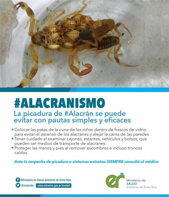 El alacranismo es de denuncia obligatoria y el antiveneno también está disponible en el Hospital Materno Infantil San Roque de la capital entrerriana y dos efectores privados.