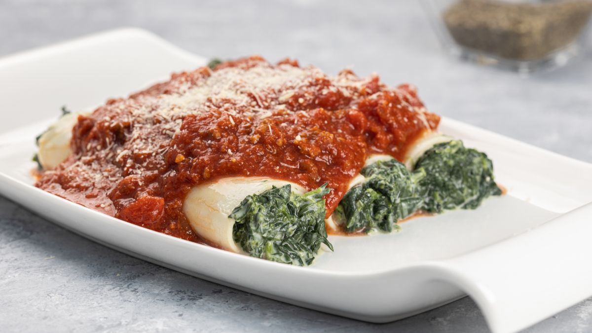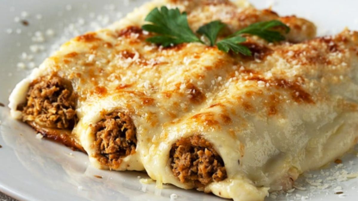 Para preparar la receta de canelones tradicionales, necesitas muy pocos ingredientes: acelga, carne molida, cebolla, queso, panqueques, salsa de tomate y queso crema. Además, están listos en tan solo 25 minutos.