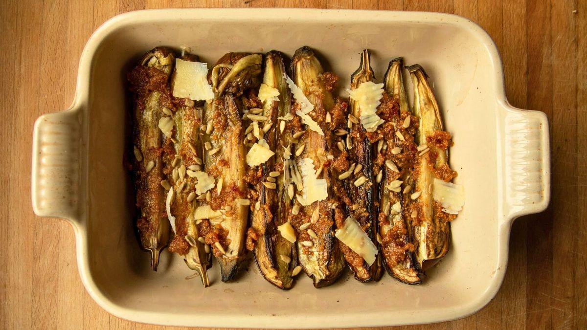 - Luego, con una cuchara, reparte el tomate por encima de las berenjenas, abriendo un poco las incisiones para que penetren los jugos.
