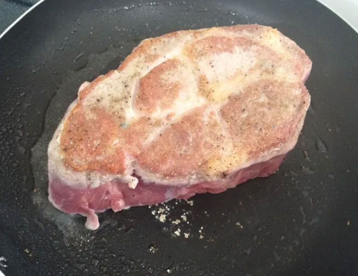 - El primer paso consiste en sellar los bifes de la bondiola de cerdo en una sartén con un poco de aceite, hasta que queden bien dorados.