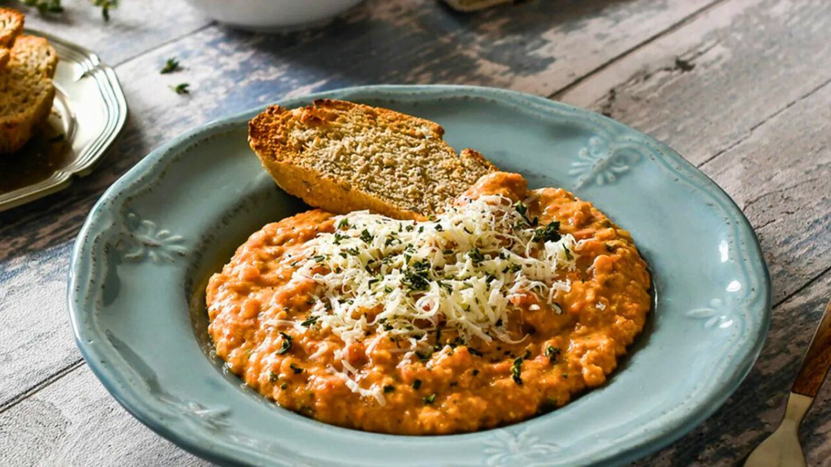 - Incorpora el tomate rallado y cocina la strapatsada a fuego medio por 10 minutos o hasta que se evapore el líquido y quede una consistencia espesa.