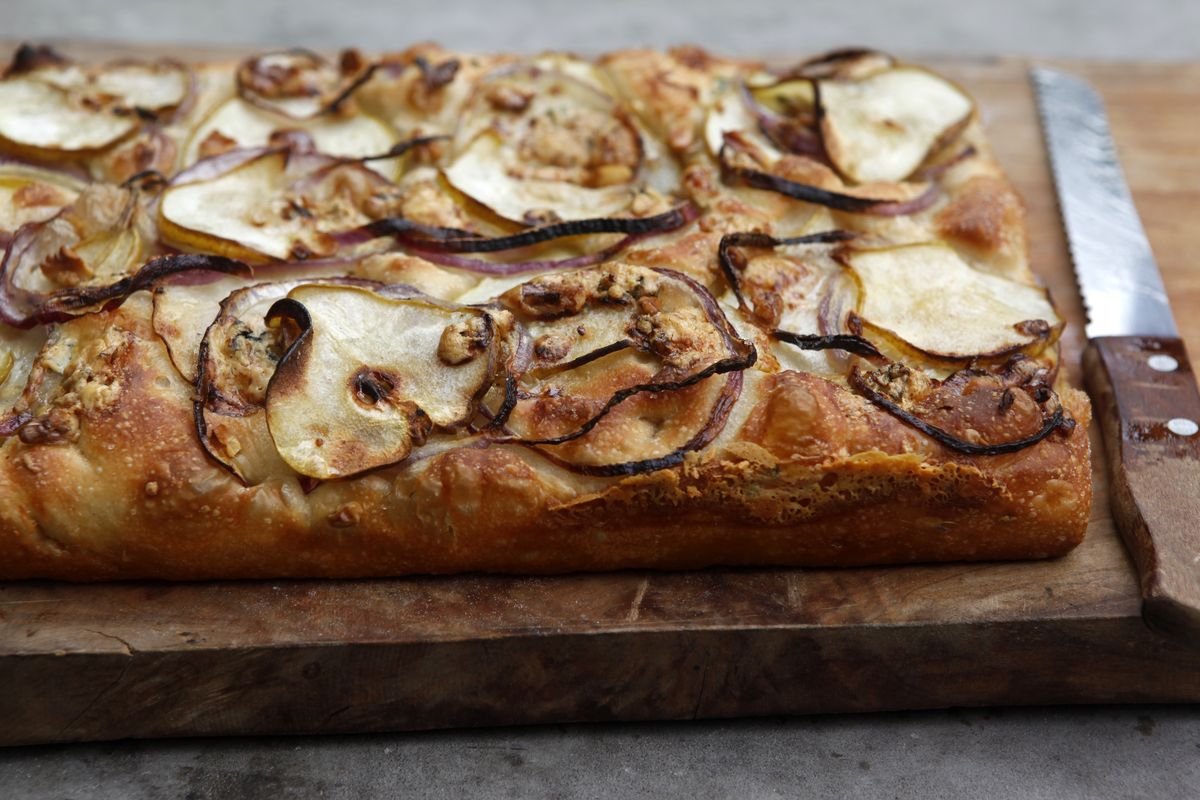 Recetas: ingredientes de la Focaccia de cebolla caramelizada, queso azul y peras