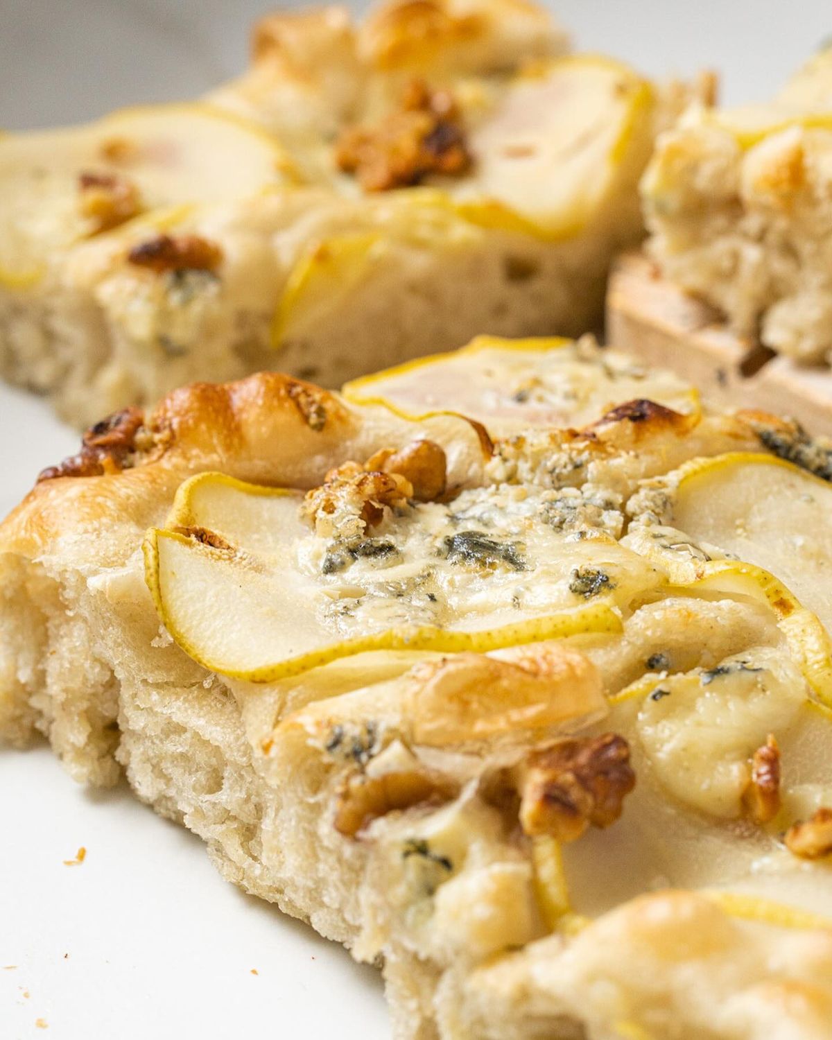 Cómo hacer la receta de Focaccia de cebolla caramelizada, queso azul y peras