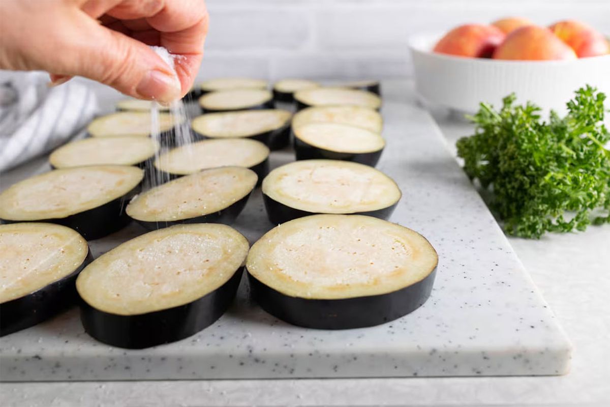 - Primero, lava y corta las berenjenas. Para quitarles el amargos, espolvorea sal y déjalas escurrir en un colador de fideos hasta que eliminen todo el líquido.