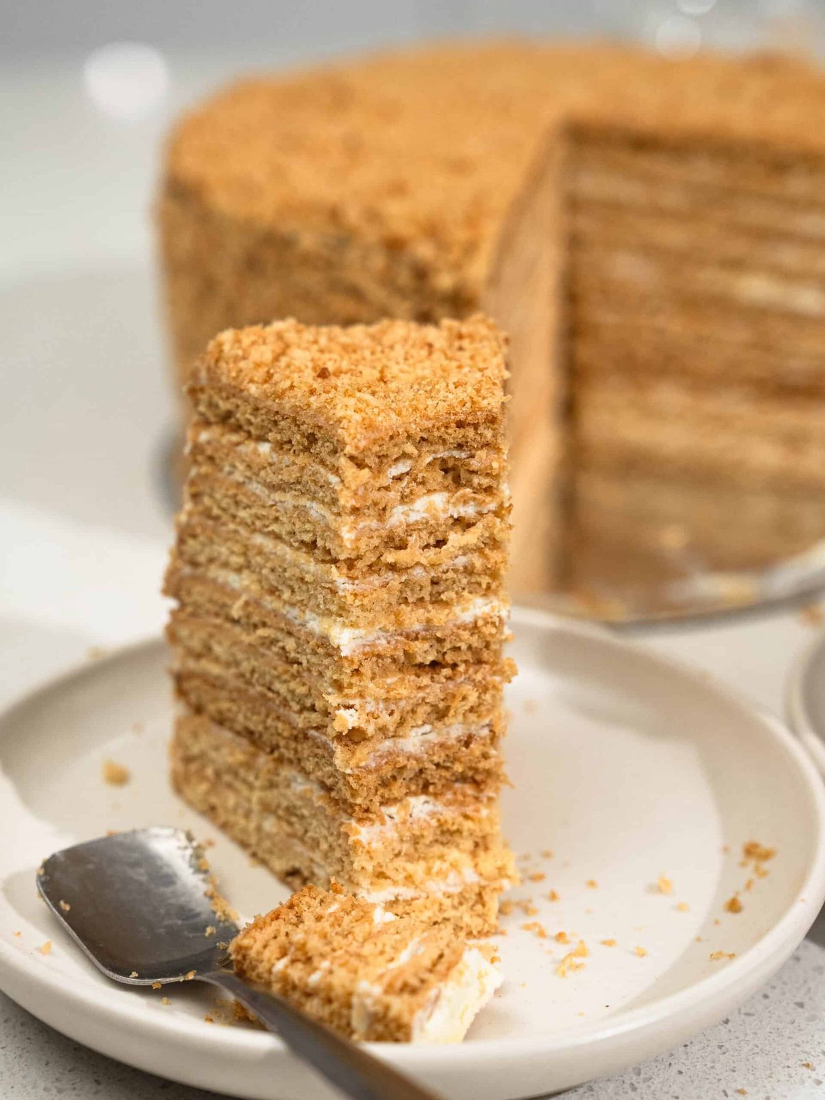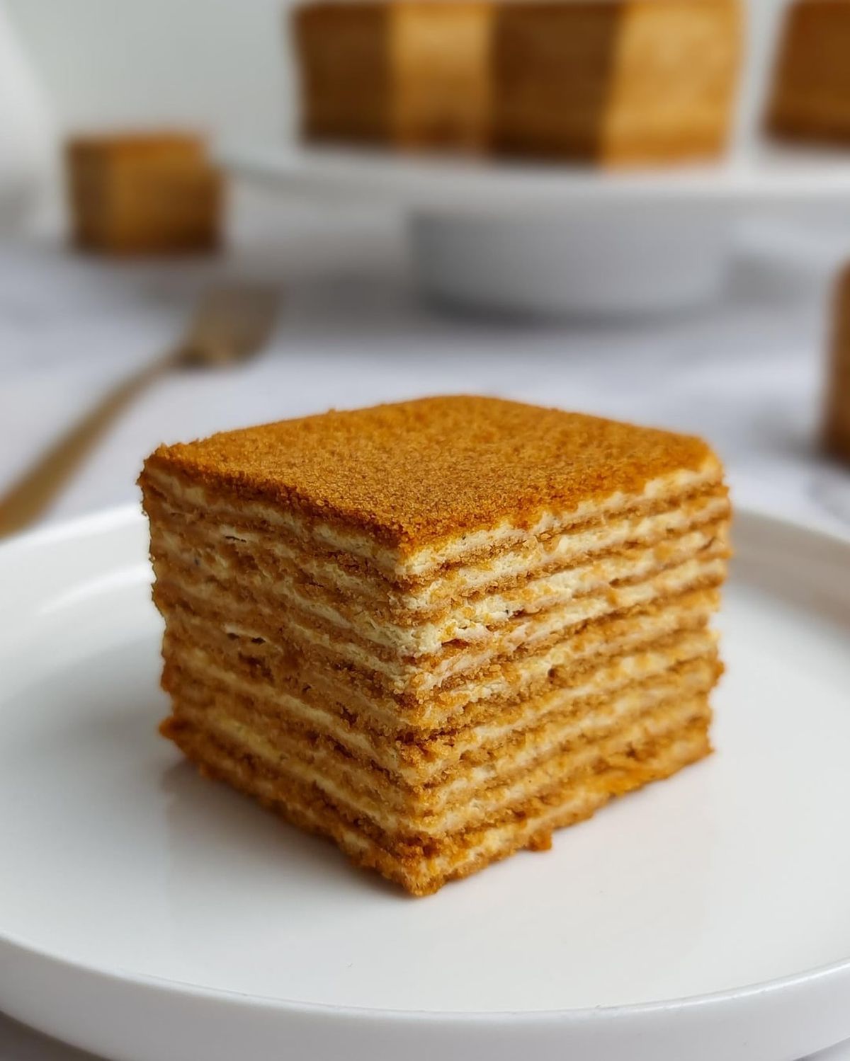 La Torta de miel, originalmente llamada Medovik, es una de las recetas tradicionales de la pastelería rusa que prepara mi abuela para cada cumpleaños familiar. Es mi favorita, porque tiene un sabor y una textura suave que no cansa al paladar. La miel le da el toque distintivo, y no puede faltar, pero no se siente "sabor a miel", propiamente dicho.
