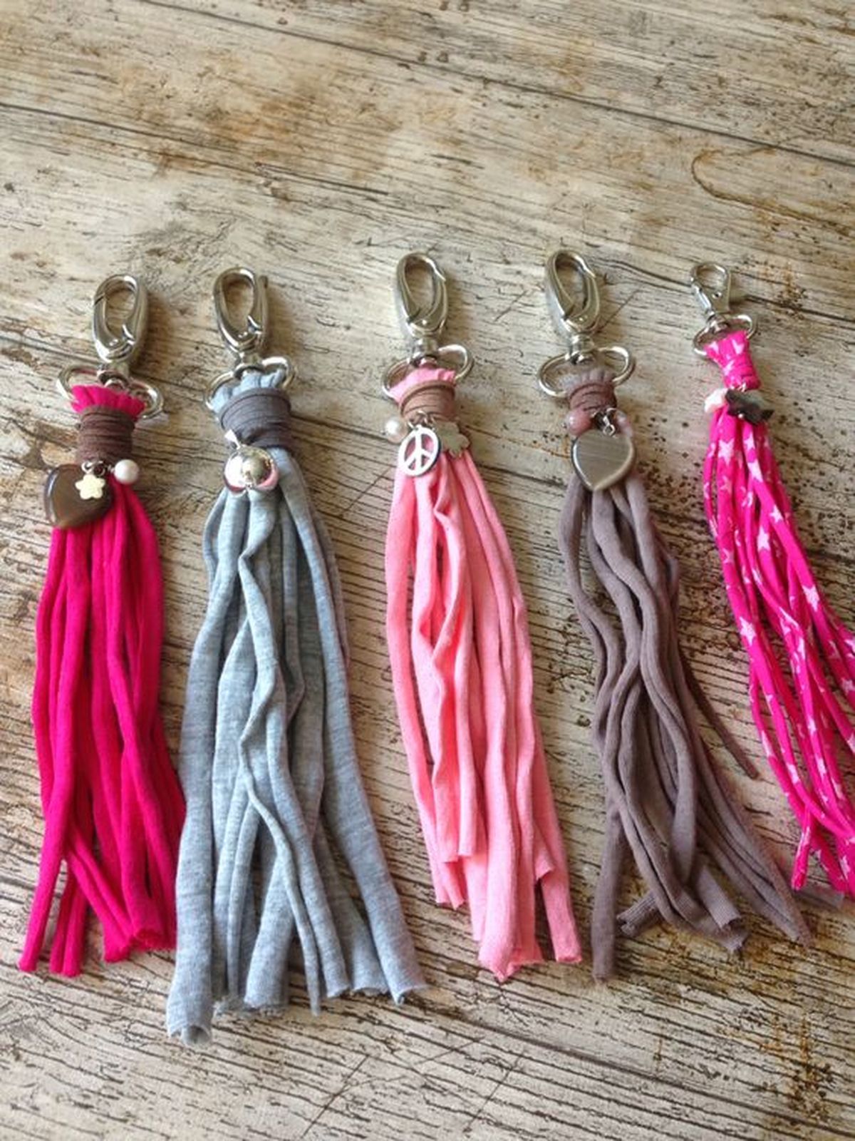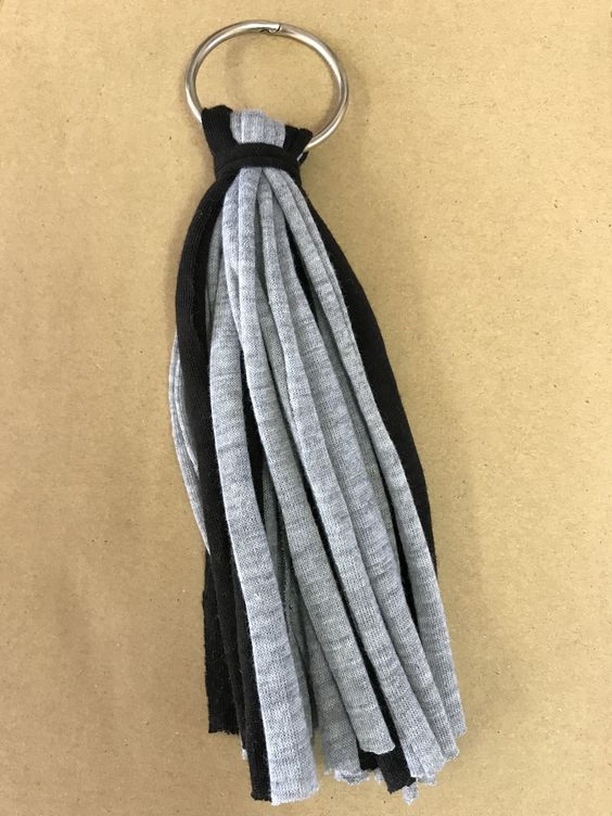 Toma la ropa interior vieja y agujereada que vayas a reciclar, lávala bien y tíñela del color que quieras con anilina o colorante. Cuando esté seca y en condiciones corta varias tiras de tela para hacer los flecos del llavero.