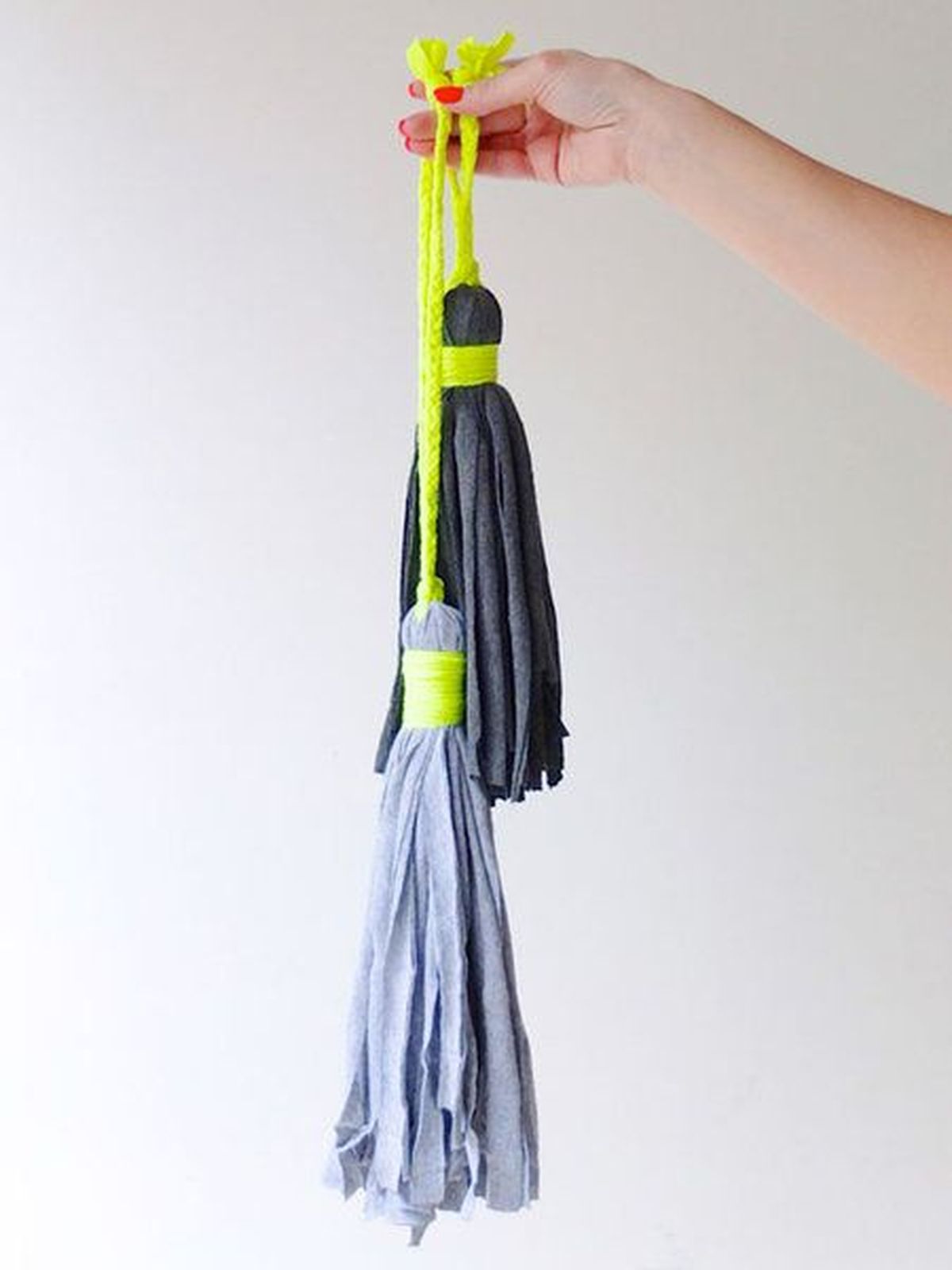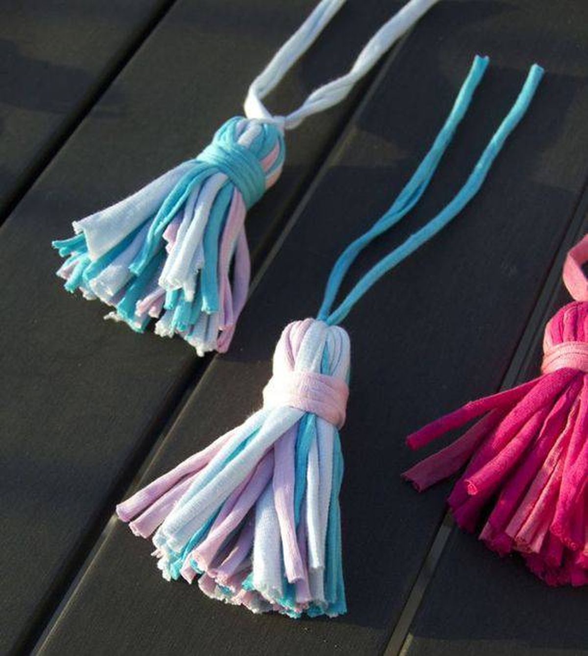 Para hacer unas bellas borlas para decorar las puertas de tu hogar, toma la ropa interior que vayas a reutilizar, lávala, tíñela con anilina y corta varias tiras lo más largas posible. Cuando tengas una buena cantidad, júntalas y dóblalas por la mitad. Con el hilo comienza a dar varias vueltas al rededor de las tiras para darle forma de borla dejando una especie de cabecita en la parte superior del doblez.