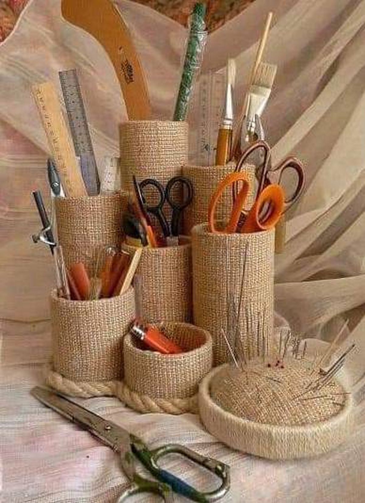 La tela de arpillera es un género que a veces se encuentra en las casa por diferentes motivos. Si este es tu caso junta este material o bien puedes comprarlo ya que es muy económico y crea este espectacular organizador de útiles y escritorio.