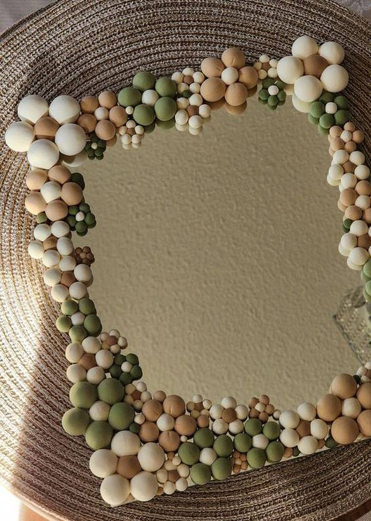 Cuando se hayan secado todas, toma el espejo del tamaño y forma que tengas, puede ser circular, cuadrado o rectangular, y empieza a pegarle las pelotitas de telgopor en los bordes. De esa forma, conseguirás un original marco para el espejo. Si quieres puedes pegarlas de manera bien ordenada o bien jugar un poco con las disposiciones y que quede más descontracturado.