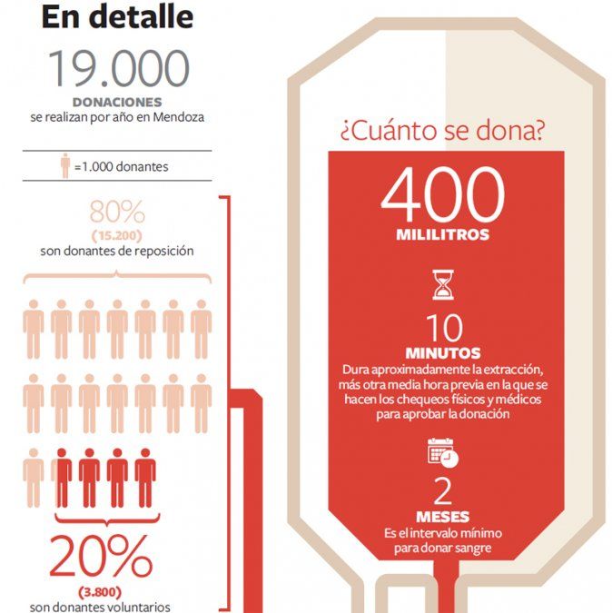 Anualmente en Mendoza se realizan unas 19.000 donaciones, de las cuales casi el 80% se trata de donantes de reposición. Esto quiere decir que no son voluntarios, sino que responden a un pedido de donación en particular, generalmente por algún familiar o conocido internado.