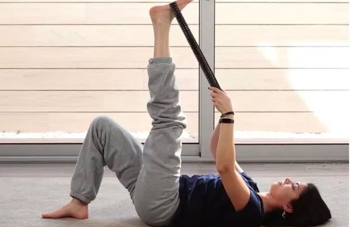 En esta oportunidad puedes utilizar un pañuelo o corbata, sirve para estirar los isquiotibiales y la cadera posterior.