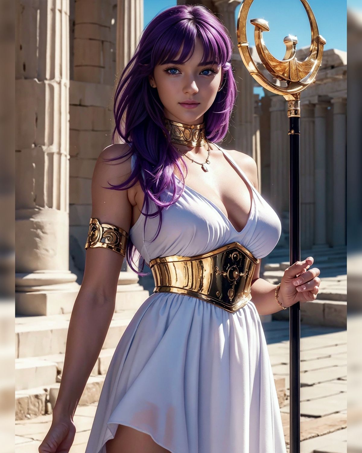 Atenea desempeña un papel fundamental, siendo la deidad por la cual los Caballeros del Zodiaco luchan para proteger las 12 casas y otros templos. La Inteligencia Artificial, al recrear su apariencia humana, ha respetado minuciosamente sus rasgos distintivos, dando vida a una versión realista y hermosa del personaje que ha dejado fascinados a los seguidores.