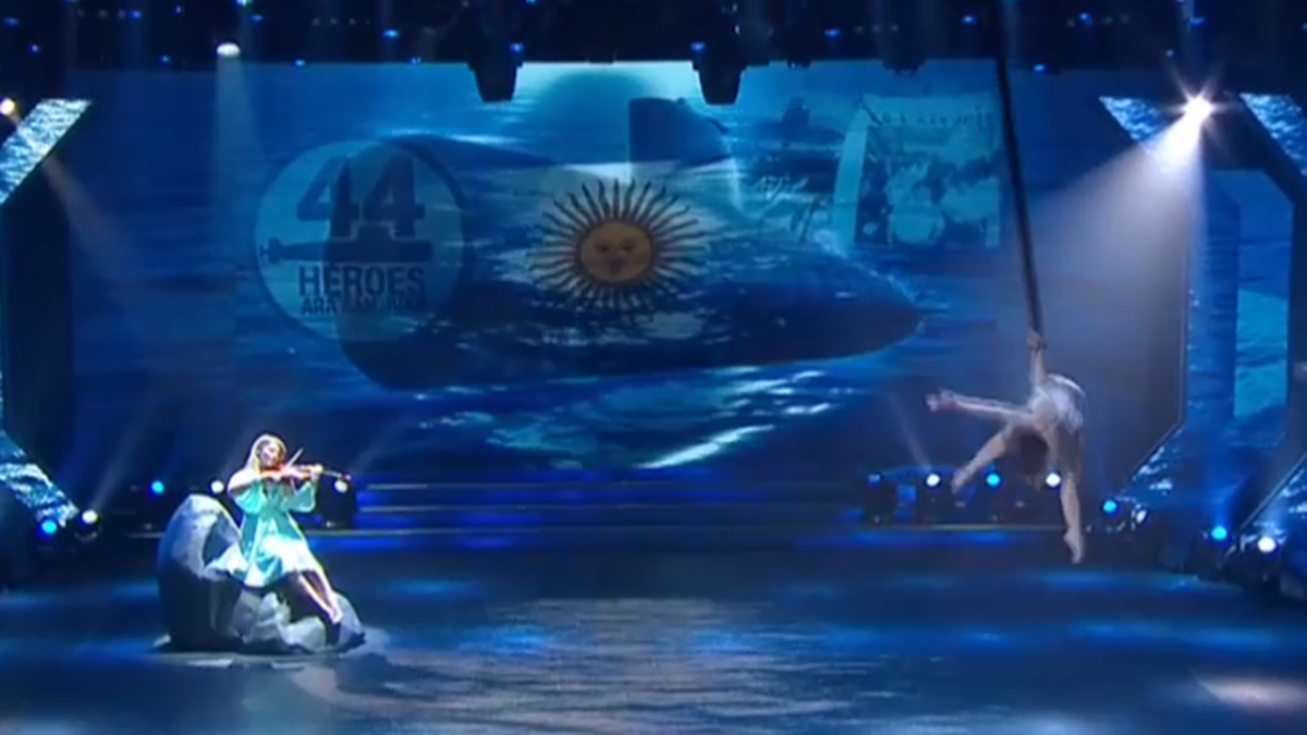 Un violín apareció en escena entonando la melodía del Himno Nacional Argentino mientras imágenes del submarino y una bandera flamante acompañaban desde las pantallas del estudio.