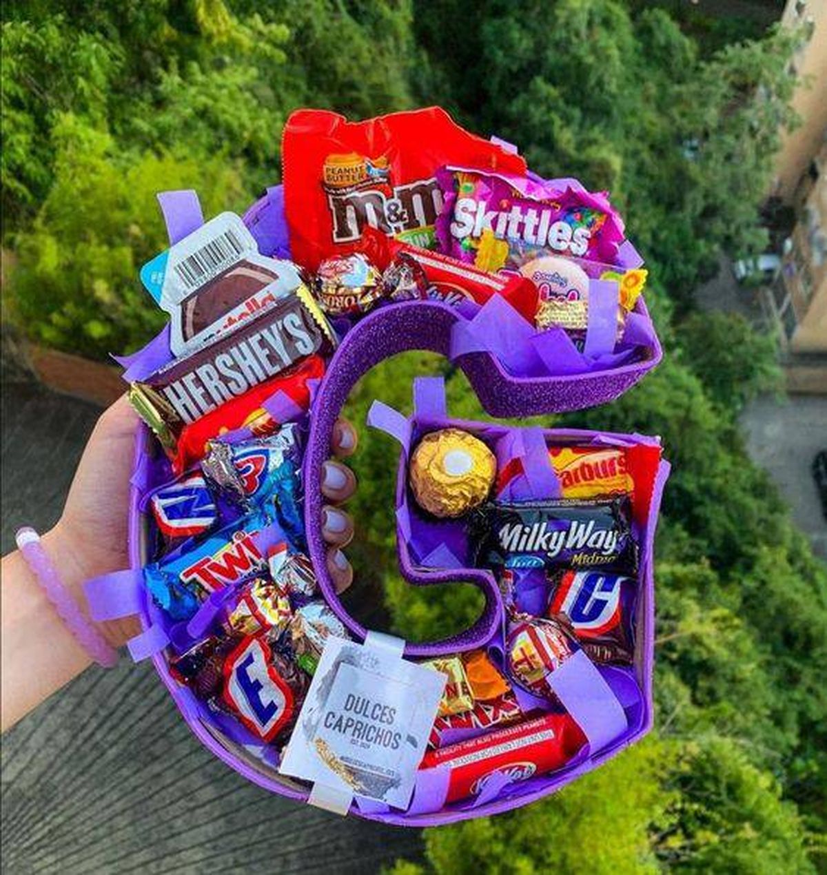 Si tienes en casa una caja de cartón o madera sin usar, puedes darle un nuevo uso y reciclarla con esta idea. Si quieres puedes pintarla o dejarla como está, luego colócale en la base viruta formando una especie de colchón y luego agrega todas las golosinas o los elementos que quieras regalarle a la persona. Por último, súmale el cartelito con la dedicatoria.