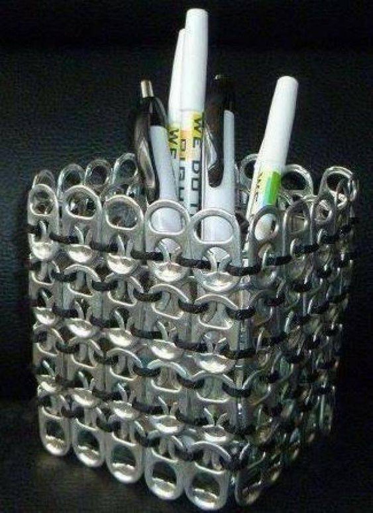 Toma la lata de conserva vacía o el tarrito de plástico que puede ser un envase vacío para reciclar, y comienza a pegar una por una las chapitas de lata. Al finalizar puedes pintar el porta lápices con aerosol o acrílico del color que desees y listo. Tendrás un hermoso porta lápices para organizar tus útiles.