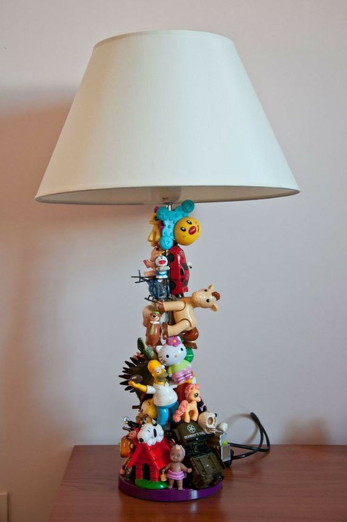 Agarra los juguetes y límpialos bien. Luego comienza decorar la lámpara pegando cada uno de los juguetes desde la base hacia arriba. Es una hermosa idea para reciclar los juguetes viejos.