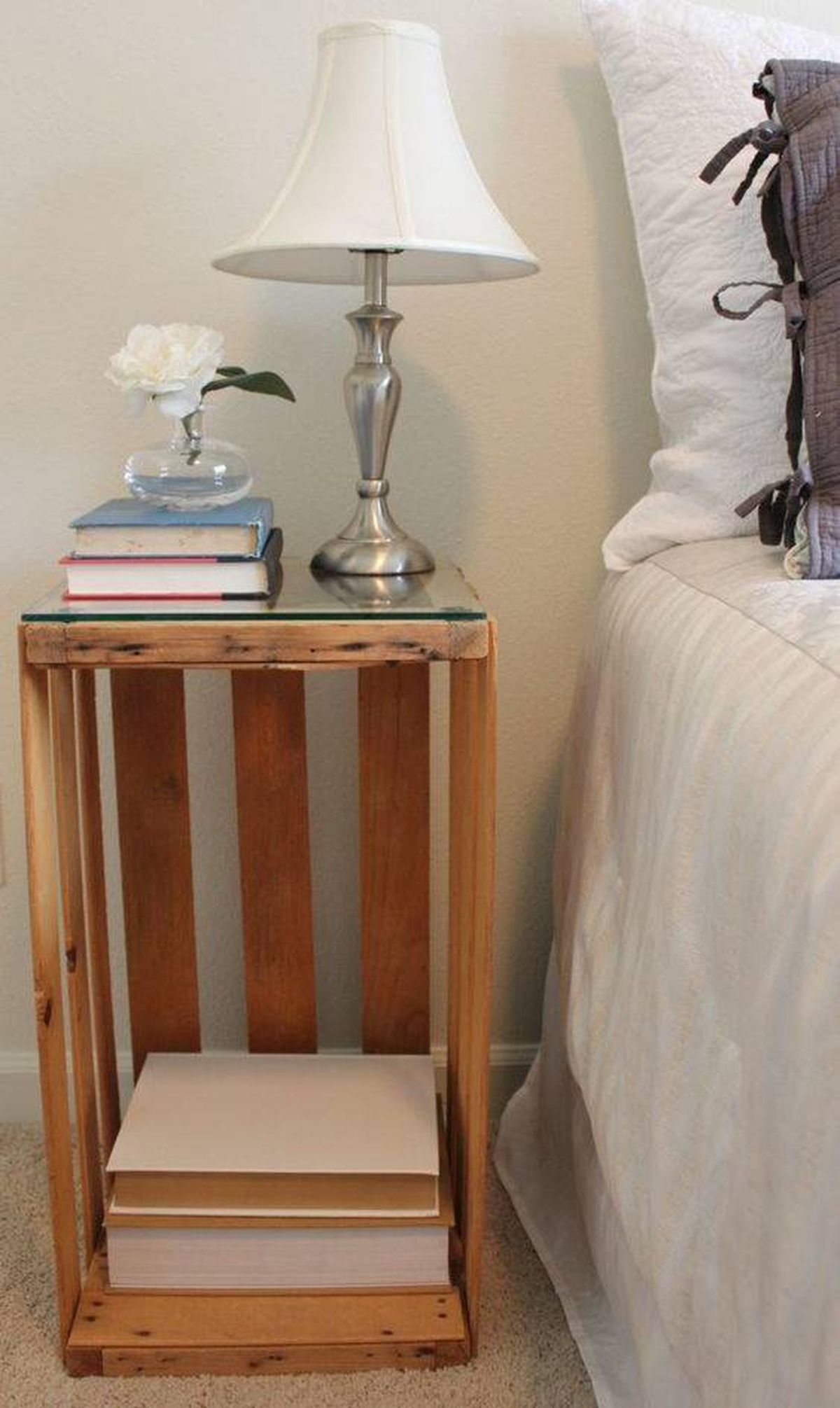 Lija el cajón de madera y dale una capa de barniz y protección. Luego colócalo de manera vertical y sobre la cara superior pégale el vidrio para que sirva como base. Ubícalo en el cuarto y listo.