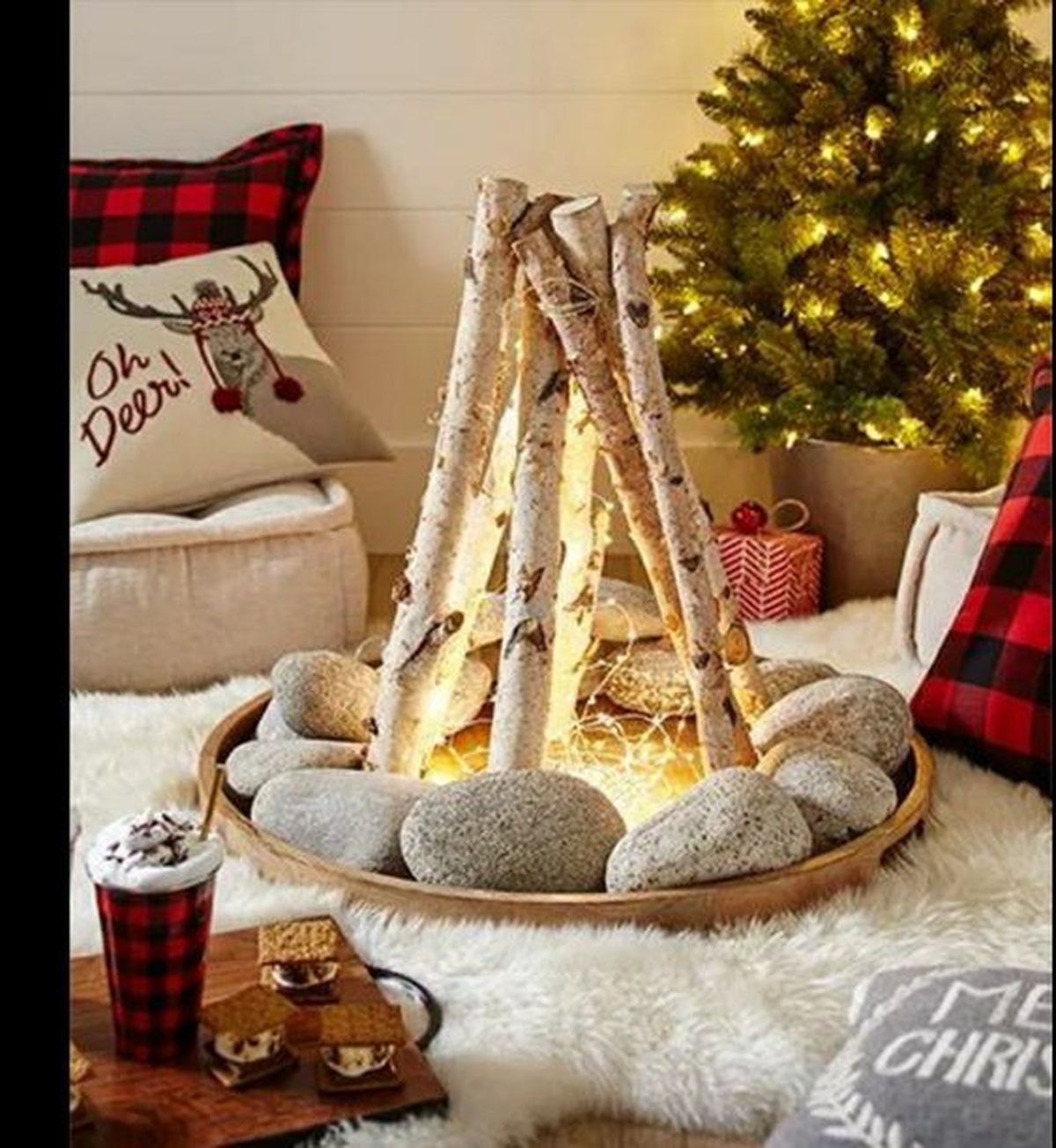 Toma las ramas del árbol y córtalas en distintos tamaños. Luego agarra la bandeja y coloca las piedras alrededor, después arma una fogata con los palos de madera uniéndolos arriba para que no se desarmen con una cuerda. En el medio pon las luces navideñas y listo. Tendrás un adorno muy bello para ubicarlo en un rincón especial o al lado del pinito de Navidad.