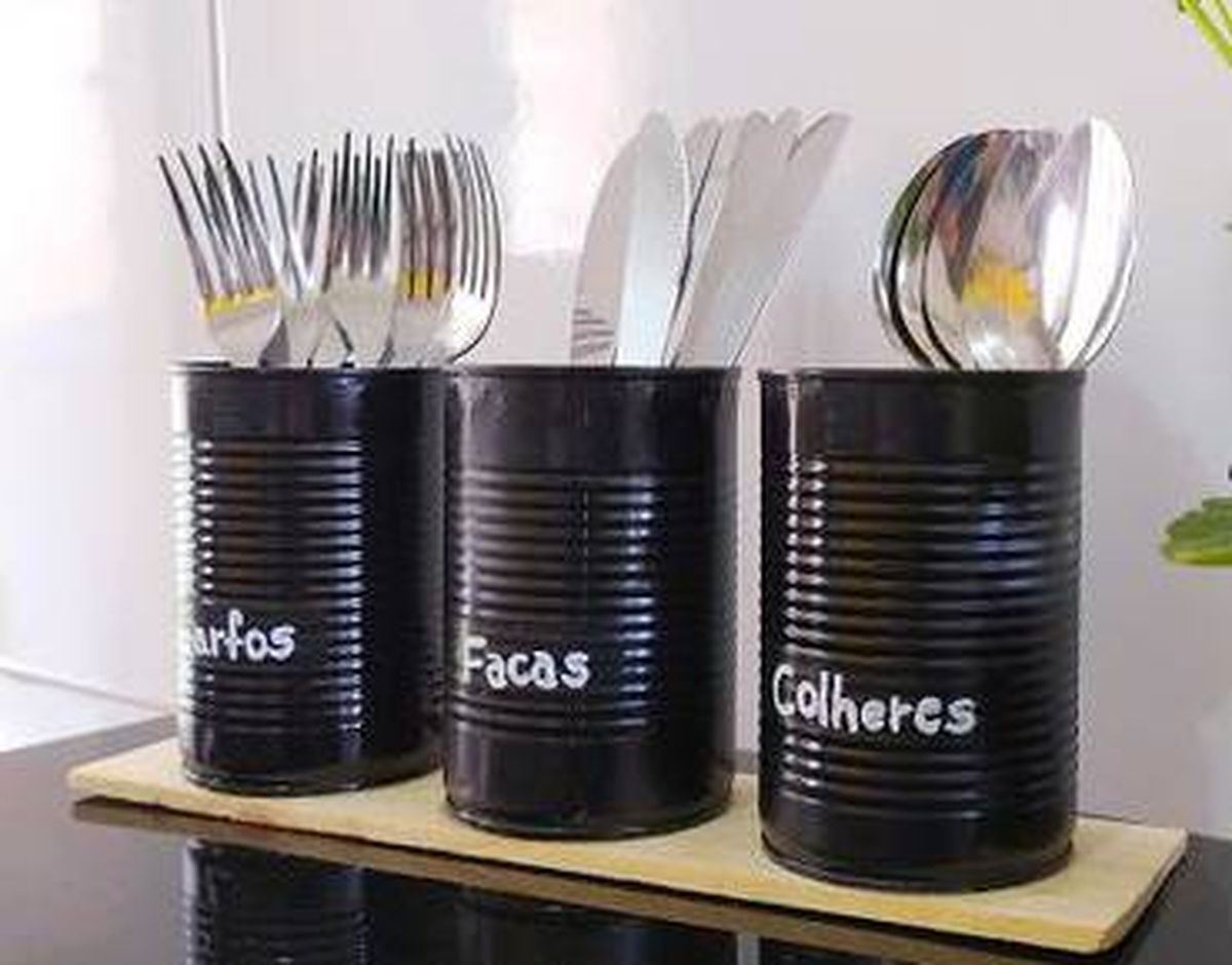 - Latas de conservas: son ideales para guardar y organizar los utensilios de cocina como cucharas de madera, batidores y espumaderas. Pinta las latas con el color que quieras y dibuja el diseño que desees. Además, puedes crear un organizador juntando distintas latas de distintos tamaños.