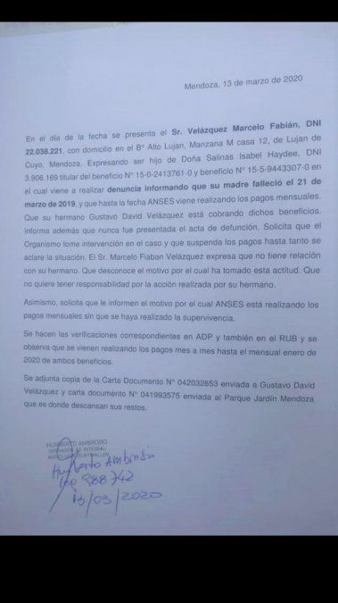 Este domingo 21 se cumplieron dos años de la muerte de Chabela. "Fui hace unos días a preguntar por la situación de mi mamá al cementerio. Los restos están ahí, descansando el el Cementerio Parque, pero su muerte no está asentada", cuenta su hijo, Marcelo Velázquez. La falta de este acto administrativo ha hecho durante estos dos años que a Chabela, Isabel Haydee Salinas de Velázquez, ANSES le continúa depositando puntualmente sus beneficios de pensión y jubilación, según denuncia el mismo Marcelo.