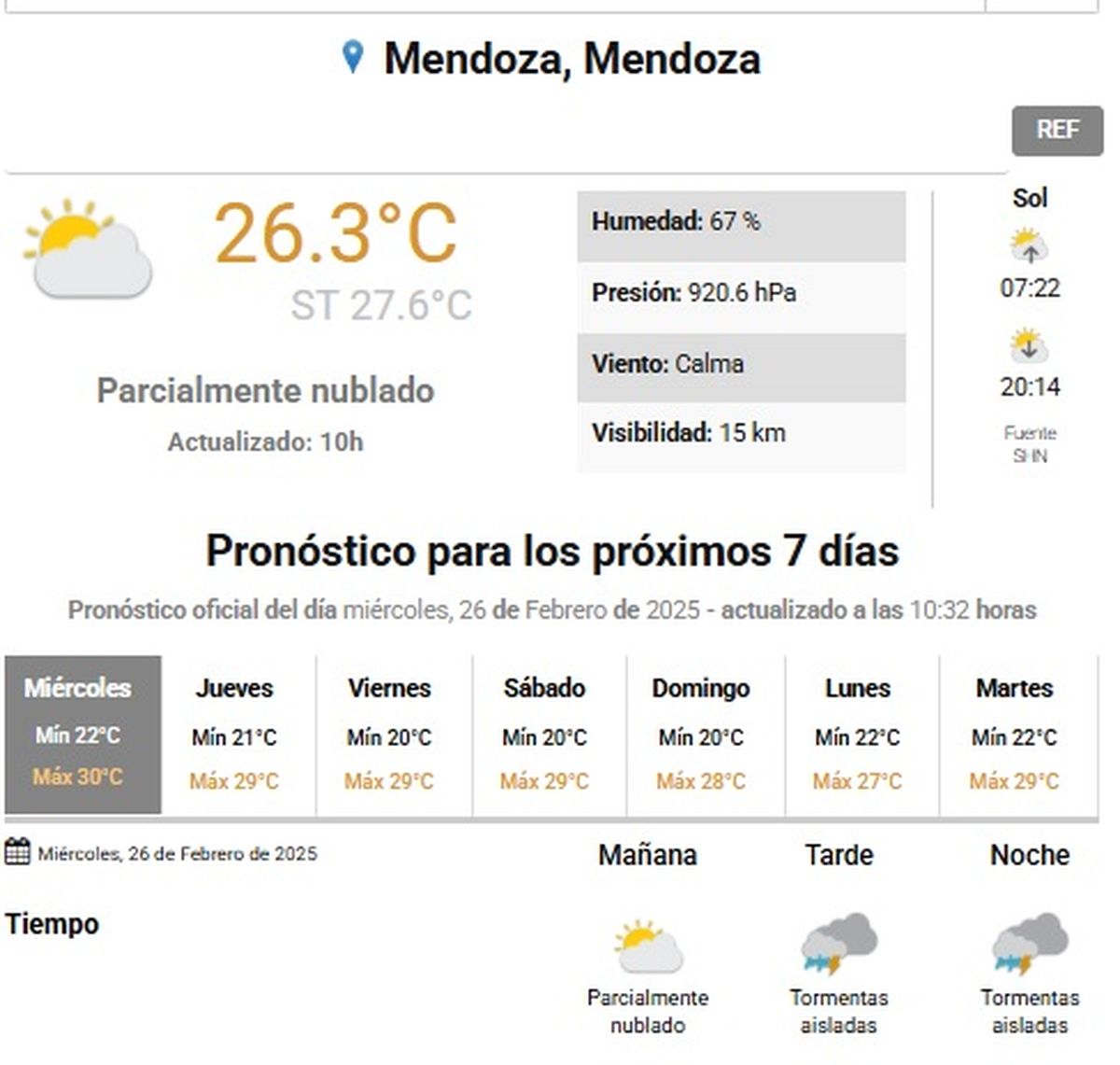 El Servicio Meteorológico Nacional compartió a qué hora llegará el granizo a la provincia de Mendoza. En su página oficial publica que en horas de la tarde, después de las 14, habrá tormentas aisladas con una probabilidad de precipitación de 40%. La sensación térmica es cálida, como 26°C. Pronóstico de cielos parcialmente nublados como a las 11:00. Hoy, la temperatura oscilará entre 23 °C y 30 °C.