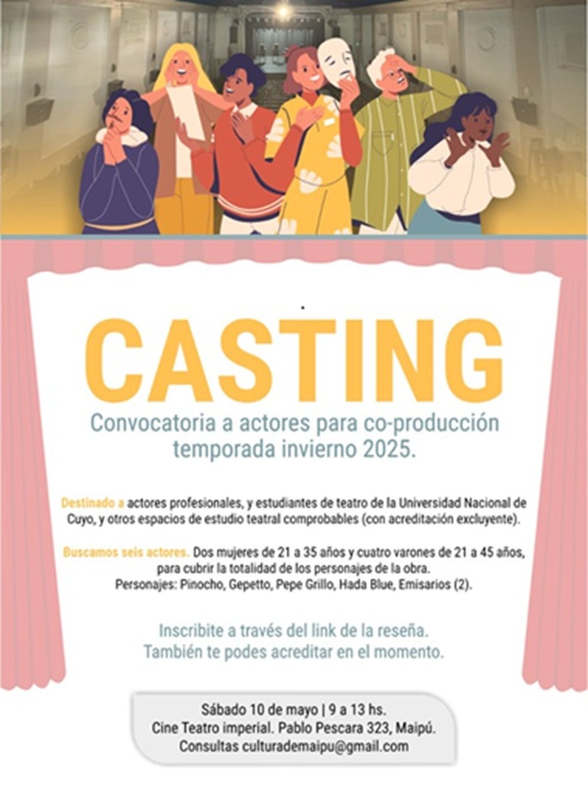 La municipalidad de Maipú y el productor general Francisco Carrasco convocan a actores profesionales, y estudiantes de teatro de la Universidad Nacional de Cuyo, y otros espacios de estudio teatral comprobables, con acreditación excluyente para ser parte de la coproducción temporada invierno 2025.