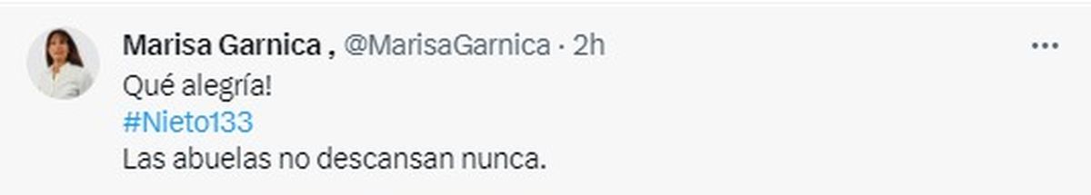 El secretario de Derechos Humanos de la Nación, Horacio Pietragalla Corti, también nieto recuperado, celebró este hecho en su cuenta oficial de Twitter con el mensaje que marcó tendencia "¡Bienvenido nieto 133!".