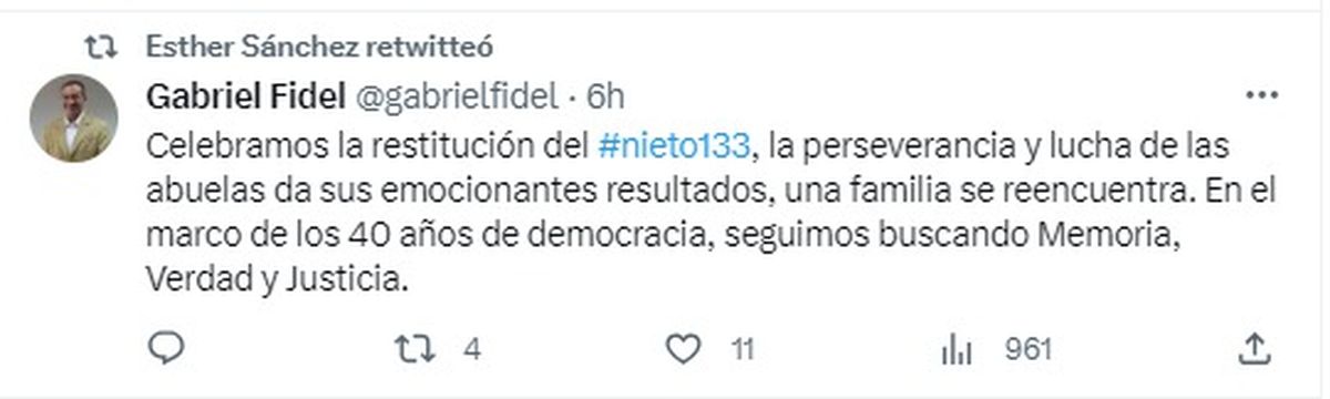 La cuenta oficial de Twitter de Abuelas comunicó que "el nieto 133 hoy se encontrará con su hermano, su hermana , su papá y una familia enorme".