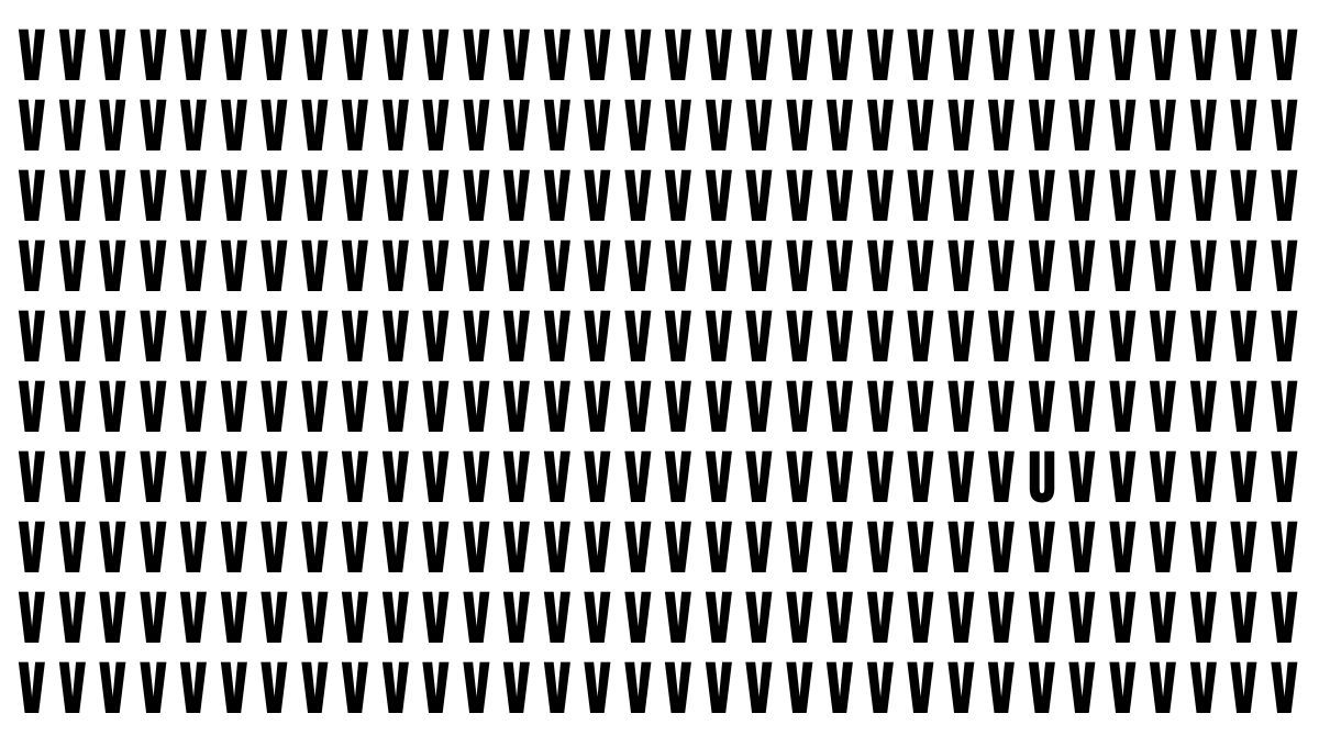 En este acertijo visual, el objetivo es encontrar la letra U oculta entre un mar de letras V. Este tipo de ejercicio desafía la percepción y la atención al detalle, y solo aquellos con una aguda capacidad visual podrán resolverlo con éxito. Al enfrentar este desafío, se pone a prueba la capacidad de una persona de detectar lo que otros podrían pasar por alto, fortaleciendo la destreza visual.