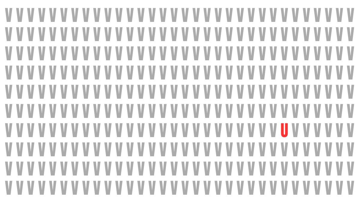 En este acertijo visual, la imagen está repleta de letras V dispuestas uniformemente, pero una letra U se encuentra camuflada entre ellas. La similitud en la forma de ambas letras hace que encontrarla sea un desafío considerable. La clave para aquellas personas que quieran jugar está en observar con atención los detalles sin dejarse engañar por la ilusión óptica.