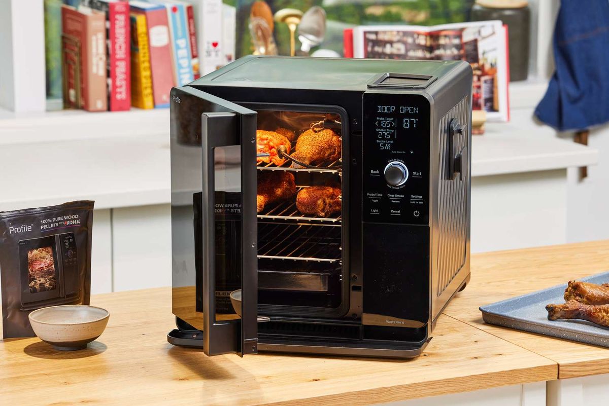 Denominado como GE Profile Smart Indoor Smoker, lo cierto es que el secreto de este invento tiene una doble fuente de calor. Una quema pellets, la otra cocina los alimentos.